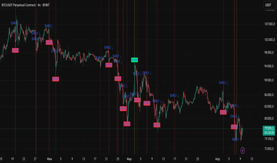 This indicator is designed to detect early and confirmed signs of high-impact market movements, such as pumps (sharp price increases) and dumps (sharp price drops). It intelligently combines multiple market signals to provide timely alerts of potential momentum spikes.