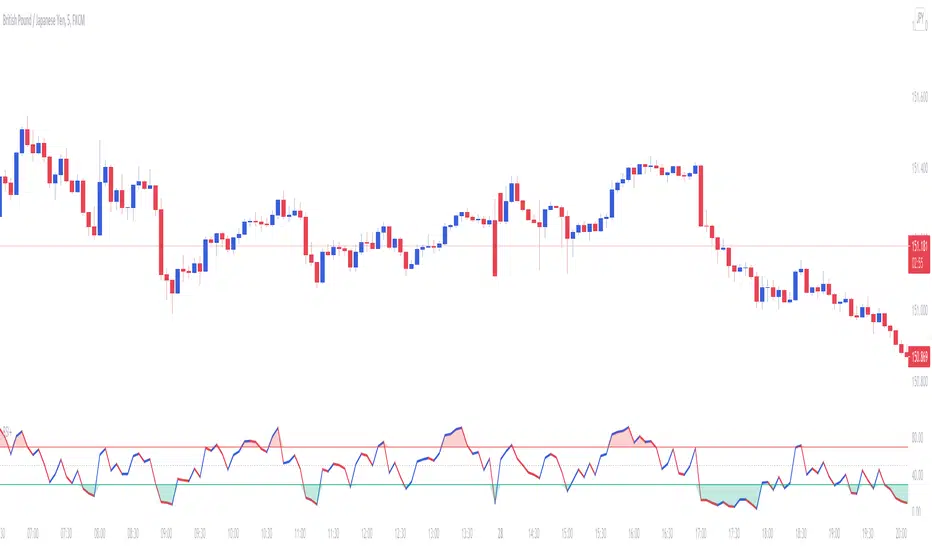 The Relative Strength Index can be used to determine Overbought and Oversold market conditions. This RSI+ indicator is set to a length faster then normal and changes color depending on momentum. When the RSI is Overbought a red shadow appears to indicate a sell is setting up. When the RSI is Oversold a green shadow appears to indicate a buy is setting up