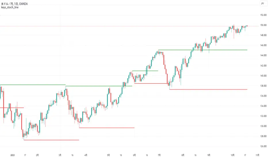 ストキャスティクスの買われすぎ、売られすぎからトレンド判断し、その転換からサポートラインとレジスタンスラインを引くインジケーター