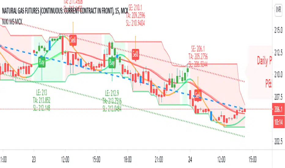 This indicator is designed specifically for commodity trading. It is more suited to scalping and intraday trading. It will work only on the 15 minute chart. From the indicator setting we can display the target and stop loss. Algorithm trading can be done by setting an alarm. The alarm LE represents long entry and the LX long entry exit. SE represents short entry and SX represents shrot entry exit. There is provision in the settings to maintain the risk reward ratio. The configuration window also contains a condition for setting intraday-timing. The indicator will display the alarm only for the selected time period.The RE:LE and RE: SE represents the re entry positions. The thicker trendline will act like support for uptrend and resistance for downtrend. The smaller trendline will indicates the small changes in the trend and suitable for scalping.
