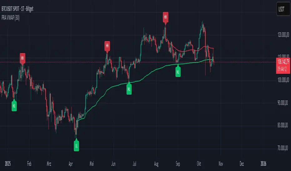 This indicator identifies shifts between top and bottom regimes through breakouts in candle body highs and lows, labeling swing points as higher highs, lower highs, lower lows, or higher lows. It then draws anchored volume-weighted average price lines starting from the most recent higher high and lower low, providing dynamic support and resistance that evolve with volume flow. These anchored lines differ from standard volume-weighted averages by resetting only at confirmed swing extremes, reducing noise in ranging markets while highlighting momentum shifts in trends.