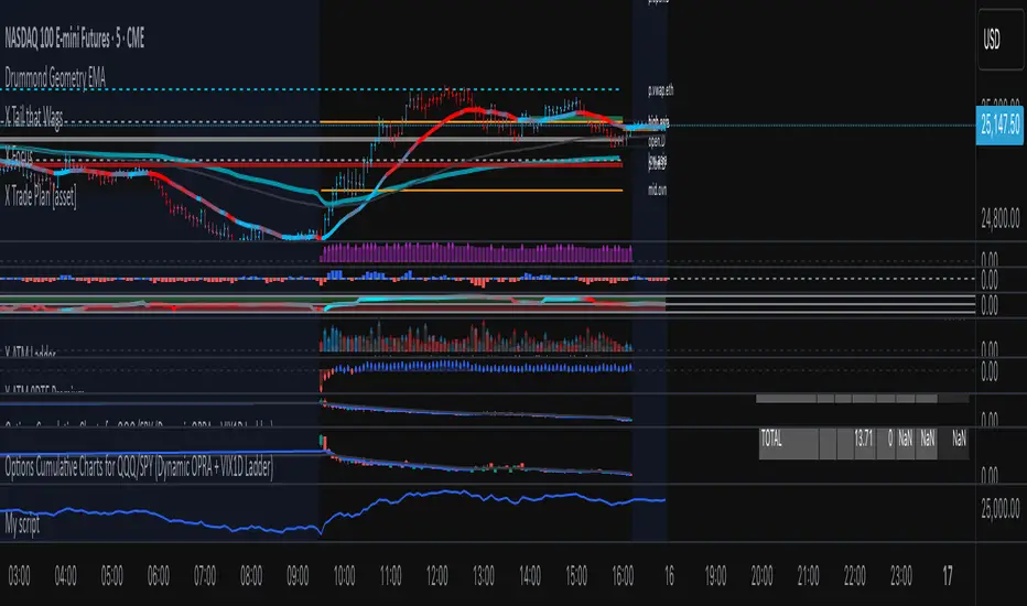 X ATM Option Ladder Premium is a specialized options-market visualization tool designed for intraday tracking of at-the-money (ATM) option premiums in index ETFs such as QQQ and SPY.The script dynamically identifies the ATM contract on every bar and plots real-time call-versus-put premium differences, with columns for positive/negative diffs and markers (blue dots for positive, red squares for negative) to represent upward price ticks in the option premiums.By analyzing premium levels and direction data from multiple strikes within a dynamic ± range (approximating 0.25 delta wings for 1DTE), the indicator produces a real-time histogram that reflects how premium skew evolves relative to the underlying price.Complementary status tables display the active strike, ladder position, IV-derived wing depth, and warnings when the underlying moves outside the monitored range.Core FeaturesDynamic ATM selection – Each bar automatically maps to the option contract closest to the underlying’s price.Bidirectional premium comparison – Visual separation of call and put premiums (optional columns), with premium diff as the primary histogram and “up” markers highlighting contracts trading above their prior close.Multi-strike ladder analysis – Samples strikes within IV-adjusted wings (±2-5 points typical for 1DTE at 15-25% IV) from the defined center to capture skew and momentum near the money; uses VIX1D for real-time IV approximation.Optimized data calls – Uses tuple requests to minimize request.security() load, enabling a wider ladder within TradingView limits.Session awareness – Restricts processing to the 9:30 AM – 4:15 PM ET option-trading window.Status dashboard – Displays date, active strike, warning flags (“⚠︎ / •outside”), wing parameters (e.g., “±3 (VIX1D=20%)”), and ladder details directly on chart.Use CaseThe indicator is intended for intraday traders and options-premium analysts who want to visualize how short-term pricing dynamics and sentiment migrate across the ATM region as the underlying moves. Typical applications include:Monitoring real-time call/put premium imbalances to detect skew shifts, put-call parity deviations, or implied vol divergences.Identifying premium clustering near the money—where theta decay or gamma effects can signal underlying price acceleration or pinning.Detecting when price exits the monitored ladder (⚠︎ / •outside), signaling a potential regime change or requiring manual recentering.Integrating premium flow into broader volatility or ETF models (e.g., VIX alignment or QQQ/SPY skew confirmation for straddle/strangle trades).Technical NotesStatic-center architecture ensures historical consistency: prior bars remain fixed even after re-centering.Ladder depth is dynamically computed for 1DTE 0.25Δ wings via VIX1D IV (fallback to fixed ±3); capped at ±5 to stay under TradingView’s security-call limits.auto_nudge is enabled to smoothly align the selected lane with the active ATM without requiring user intervention.Indicator is optimized for 1-minute to 5-minute charts; use overlay = false to preserve scale clarity. Manual 1DTE expiry input required (e.g., YYMMDD format).