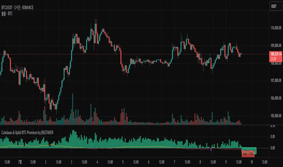 The 'Coinbase & Upbit BTC Premium by BIGTAKER' indicator calculates and visualizes the premium gap between Bitcoin prices on Coinbase, Upbit, and Binance. The purpose of this indicator is to assess the market sentiment by observing the percentage differences between exchange rates and spot prices, highlighting potential arbitrage opportunities.
