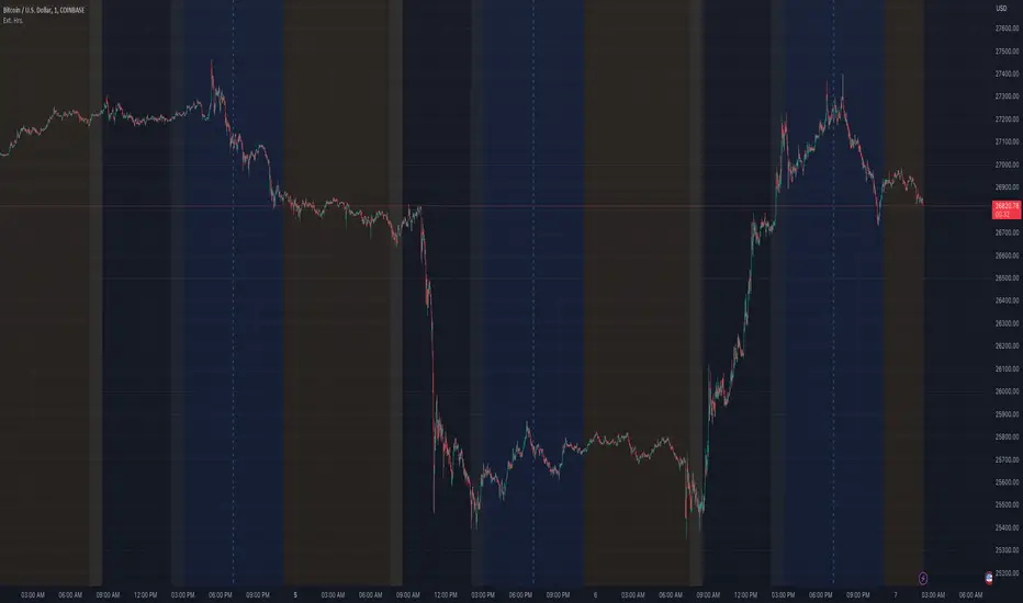This indicator mimics TradingViews "Extended trading hours" background color settings. It is most useful on symbols that do not conventionally have extended hours, but are available to trade during those hours (ie. Futures and Crypto). Because market participation (ie. volatility) in a given symbol can change dramatically at or near these transitions, seeing conventional market open / closures expedites price action context around these transitions.