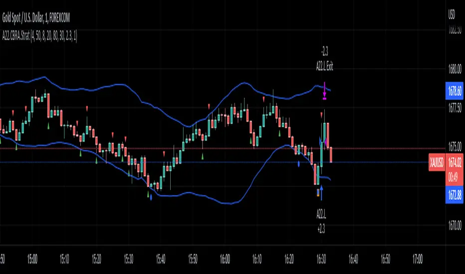 It is a simple price crossunder / crossover Bollinger Bands (BB) with a confirmation from RSI overbought / oversold signals and a fast Aroon. You will see the BB plotted with its confirmations: