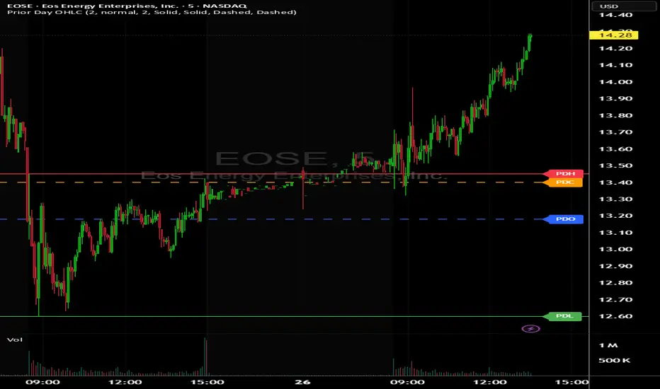 Displays the previous day's key price levels (Open, High, Low, Close) as horizontal lines on intraday charts only. Each level is fully customizable with individual show/hide toggles, line colors, label colors, and line styles (solid, dashed, or dotted). Lines can be extended backward by a configurable number of days (1-10) and automatically extend to the right edge of the chart. Compact labels (PDO, PDH, PDL, PDC) appear at the right side of each level for easy identification. Ideal for day traders who use prior day's range as support/resistance reference points.
