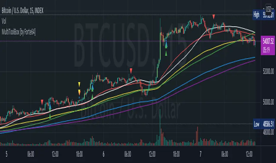 MultiToolBox has several trading tools and strategies built into it. First and most evident, it has multiple Moving Average systems built into it. There are six (6) different MAs grouped into two sets. Each set can be independently set to SMA, EMA, WMA, RMA, VWMA or HMA. Users have the option of setting the length of each of the 6 MAs separately.