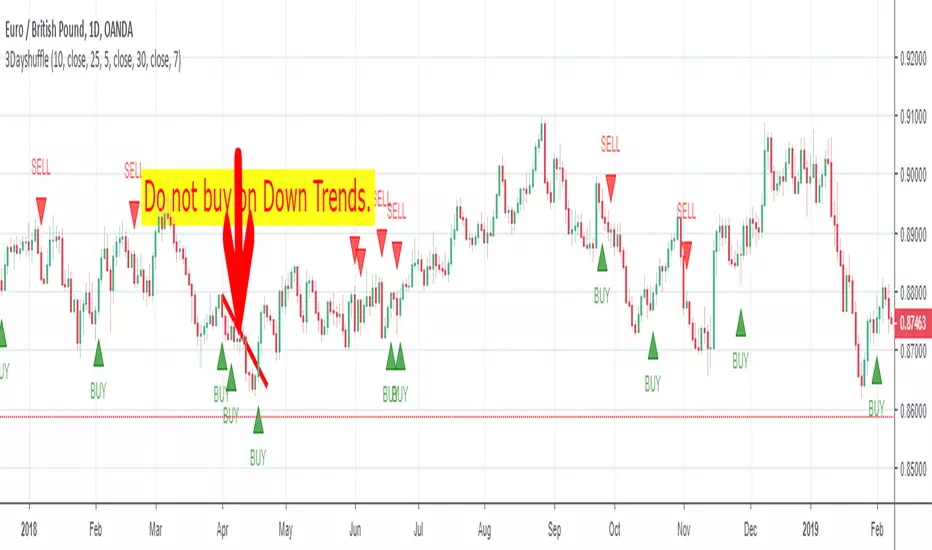 The 3 Day Shuffle Indicator indicates the best time to buy and sell based on a secret sauce. This is an Indicator not a strategy. Quick tip, keep the profits small(30-40pips) or Trail Stop it and keep the SL around 30-50 pips. Any comments Appreciated!