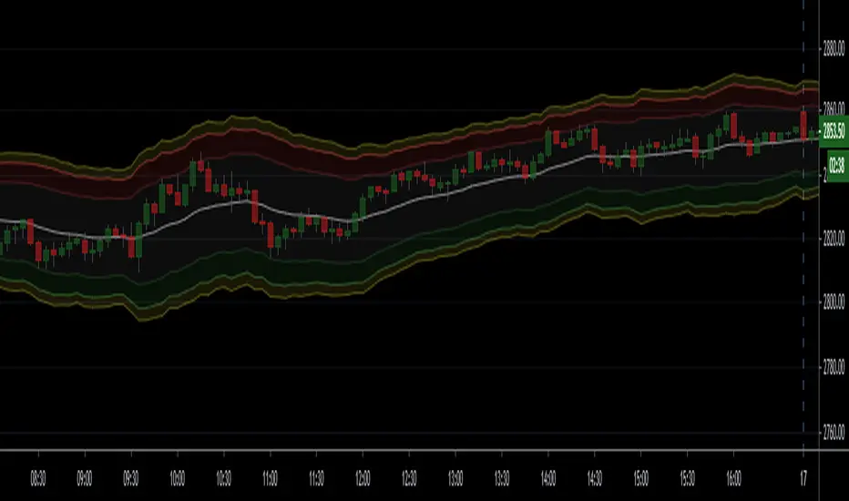 A different spin on Keltner Channels. Using 3 channels of varying widths provides a good visual for potential entries off of extremes. Normal channel is center, green and red "zones" could be used as potential entry/exit areas, and the outside yellow zones may be viewed as extremes (signifying potential breakouts or strong reversal areas).