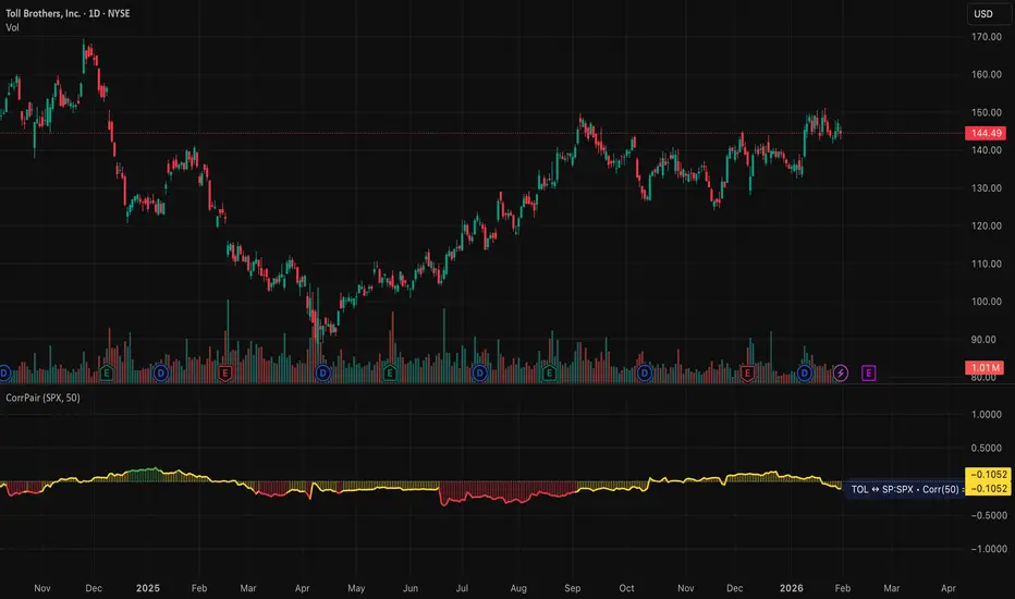 This open-source TradingView indicator computes the Pearson correlation coefficient between the chart's instrument (Ticker A) and a user-selected instrument (Ticker B). The correlation is displayed as an oscillator within the range −1..+1: