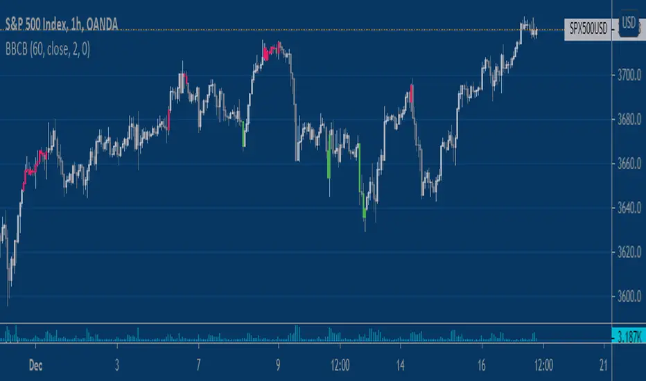 This script is a combination of my overnight fakeout script and bollinger band color bars. It's designed to be used on CME/CBOT Equity Indexes during their GLOBEX session. It uses the built in Bollinger Band script and highlights bars that exceed the upper/lower bands during the overnight session.