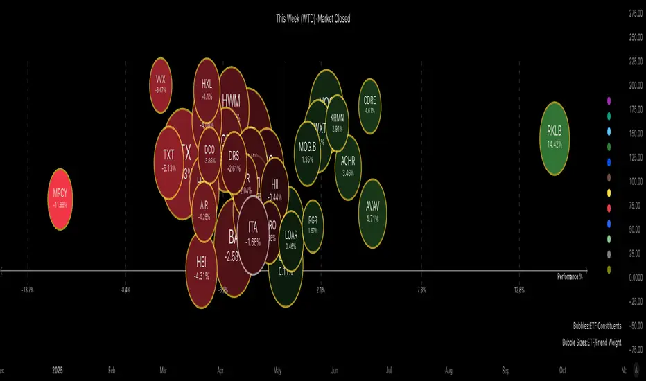 - Bubble size → market cap, relative weight, or %volume