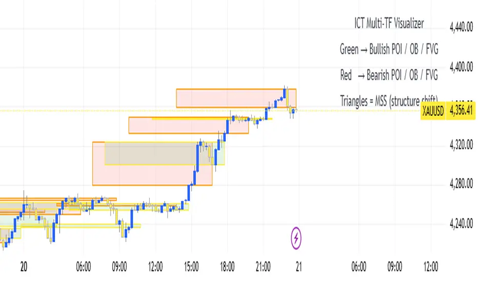 This indicator maps higher-timeframe (HTF) structure on any lower-timeframe chart to help you frame directional bias and areas of interest (POIs). It overlays three educational ICT-style components in one clean view: