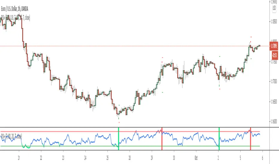 When the RSI gets above 80, the line will turn red and the script will begin looking for a specific type of engulfing candle to go short. The same is true when the RSI gets below 20, but the line will turn green and look for longs. It is best used as a back-testing aid, but it can also be used to send emails or SMS alerts whenever the conditions are met. It can also be used as an alternative colored RSI indicator by removing the signals in the settings menu and changing the RSI parameters to whatever you normally use. This can aid in RSI divergence and overbought/sold strategies.