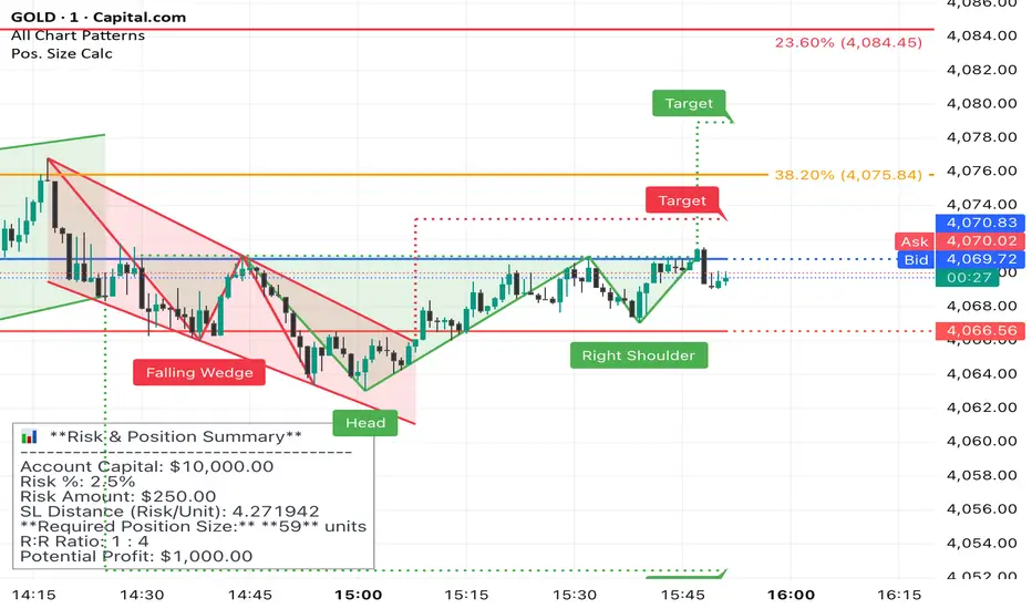 Heads-Up Display (HUD): A clean, fixed table in the bottom-left corner of the chart clearly displays all calculated metrics, including your Required Position Size (in units/shares/contracts), Risk Amount, and Potential Profit.
