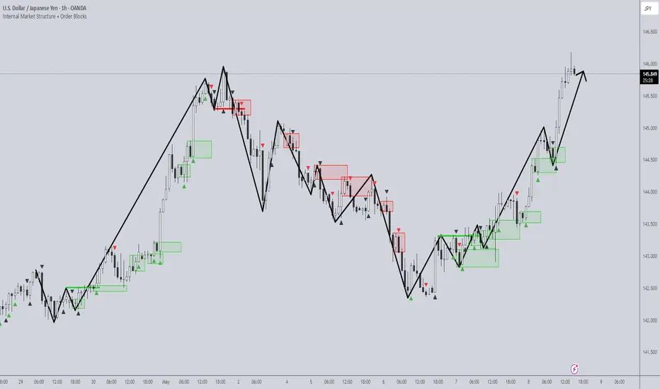 This indicator combines internal market structure shifts with order block detection to help traders identify key zones of institutional interest and potential trend reversals. It highlights bullish and bearish engulfing conditions that mark the formation of valid order blocks, and it plots internal structure shifts—early signals that may precede a larger move.