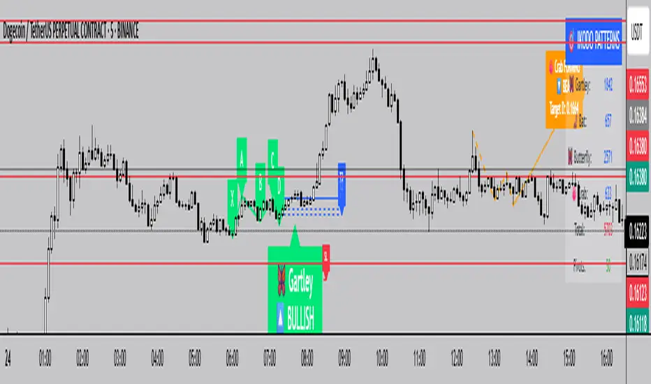 IKODO Harmonic Patterns automatically scans your chart to detect Gartley , Bat , Butterfly , and Crab harmonic patterns in real-time, using strict Fibonacci ratio checks with configurable tolerance and pivot lengths.