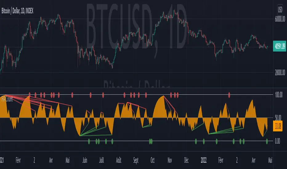 The idea is to make the oscillator tend towards 100 at each bullish Heikin Ashi candle, and inversely towards 0 when bearish.