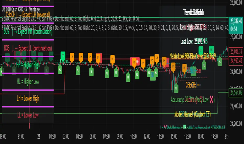 “SMC Reversal Engine v3.5 visualises HTF structure (CHoCH / BOS), swing points, FVG zones and a compact dashboard to aid Smart-Money Concept analysis. It’s for charting/education only and does NOT provide buy or sell signals.”