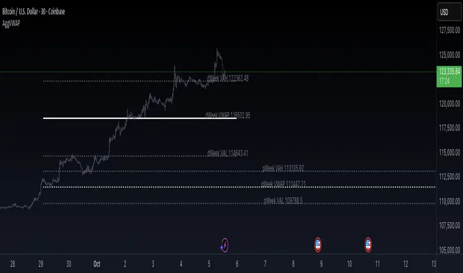 • Lines Mode → plots VWAP and deviation levels as fixed horizontal lines for each completed period (e.g., pWeek VAL, dMonth VWAP).