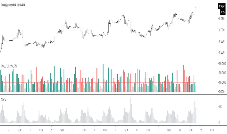 On the chart, the average spread value for the period for comparison is the red line, taken as 100%. (by default, the comparison period is 3 - that is, the last three bars)