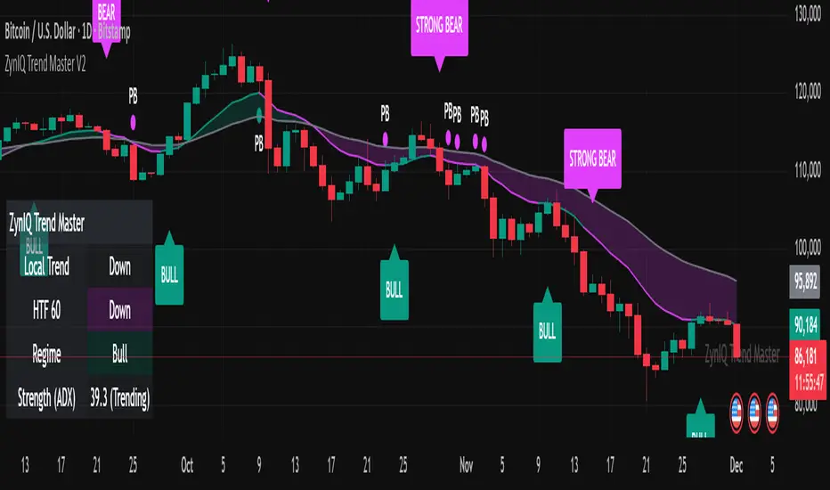 ZynIQ Trend Master v2 (Pro) provides a structured, multi-layered approach to trend analysis. It combines volatility-aware trend detection, adaptive cloud colouring, and pullback signalling to help traders see trend strength, continuation phases and potential shift points with clarity.
