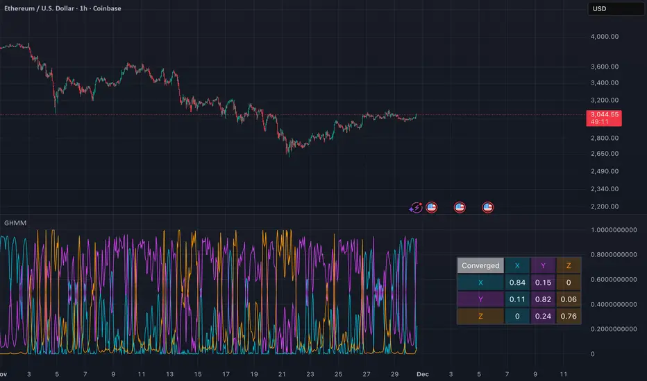 When the "Test Out of Sample” option is enabled, the indicator plots models out-of-sample predictions. This is particularly useful for real-time identification of market regimes, ensuring that the model's predictive capability is rigorously tested on unseen data. The indicator displays the out of sample posterior probabilities which are calculated using the forward algorithm. Higher probability for a particular state indicate that the model is predicted a higher likelihood that the market is currently in that state. Evaluating the models performance on unseen data is crucial in understanding how well the model explains data that are not included in its training process.