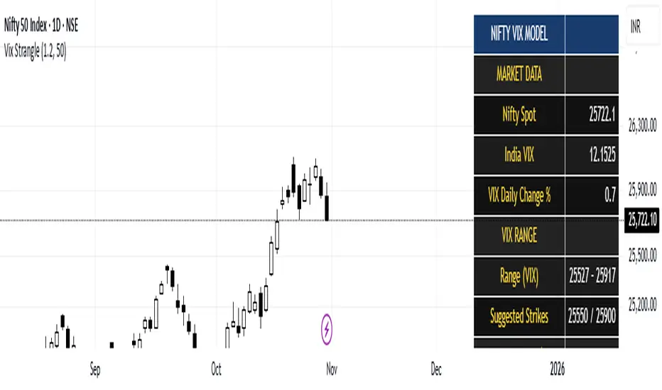 This script provides a professional on-chart dashboard that converts India VIX into actionable trading levels for Nifty. It calculates the VIX-based expected daily move, projected price ranges, expanded 1.2× ranges, and suggested strangle strike prices. Includes clean formatting, color-coded sections, and real-time updates.