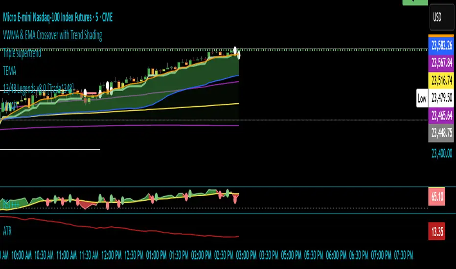 Customizable RSI indicator with bullish and bearish color coding and pivot dots when RSI crosses its moving average.