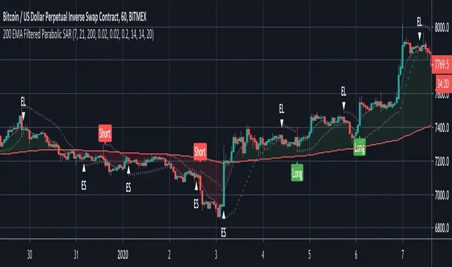 This script uses Parabolic SAR with the 200 EMA to determine long and short trends. Only long signals are given when the price is above the 200MA and shorts when it is below. Signals are further filtered using ADX to reduce noise.