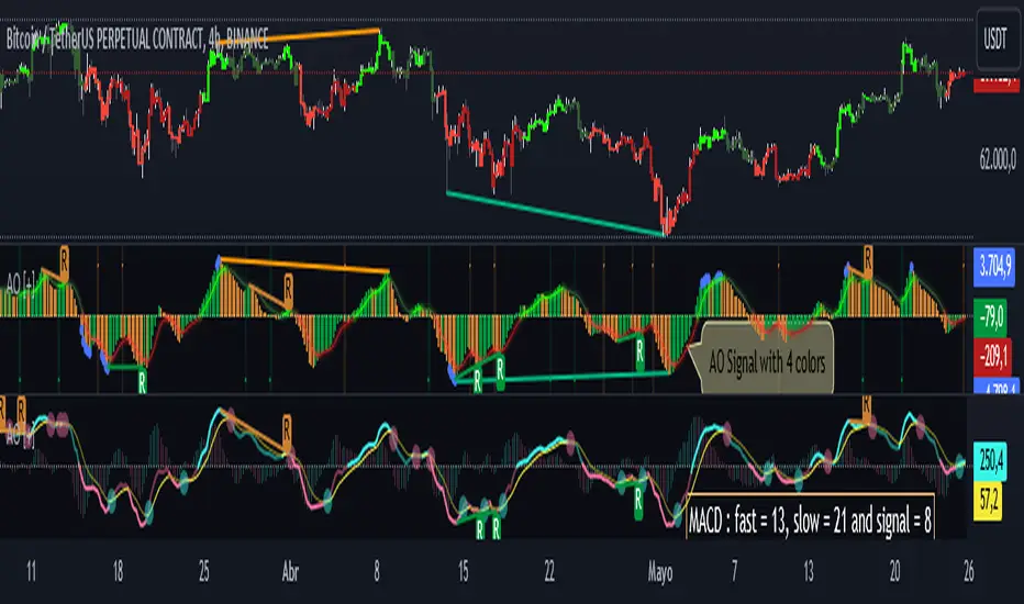 The "Awesome Oscillator" signal line now has 4 colors, above the zero level the light green color indicates bullish strength, and the dark green loss of strength, the same for the red color when the signal is below the zero level.