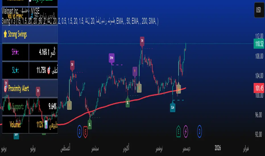 Swing v.3 هو مؤشر متقدم لتحليل نقاط التأرجح (السوينق) والزخم السعري مع تحليل عميق للسيولة وحجم التداول: