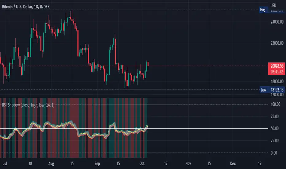 The indicator works under all timeframes, but it appears to provide a very reliable information with longer timeframe. The background highlighting showing the bullish/bearish sentiment based on the RSI Shadow appears to indicate crypto market cycles relatively reliably, with 2-3 consecutive bars with the same background color indicating a strong trend.
