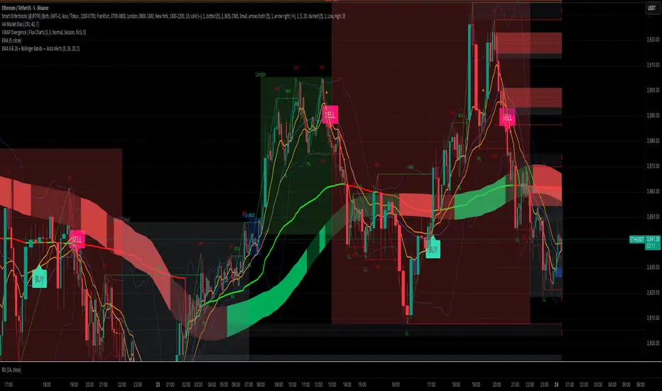 This indicator combines **EMA crossover strategy** and **Bollinger Bands** to generate high-clarity **Buy/Sell signals** for any market (crypto, forex, stocks).