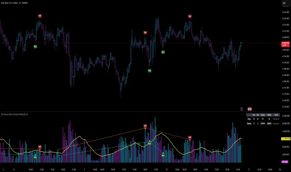 The Pine Script indicator named "SK Volume Pane V2.0[CLEVER]" is a comprehensive volume analysis tool designed for use in a separate pane below the main price chart (due to overlay=false). It helps traders identify potential trend reversals and continuations by combining standard volume analysis with sophisticated volume divergence detection and a statistical tracking table.