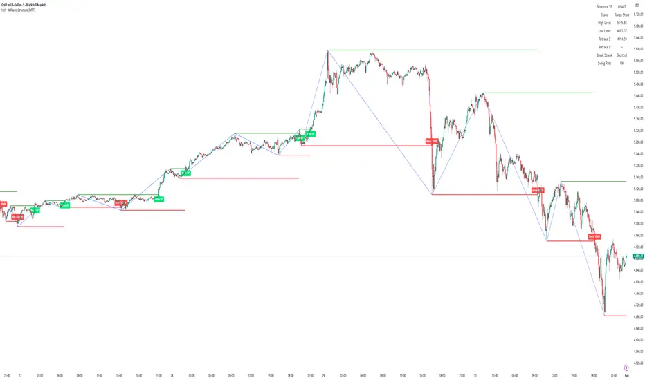 This indicator plots the “Williams Structure” as an MTF (multi-timeframe) overlay directly on the chart. It marks confirmed structure highs and lows and can optionally display retrace lines as well as a swing connection (Low→High→Low→…).