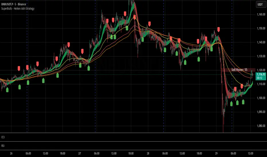 A streamlined, trade-ready strategy from the SuperBulls universe that turns noisy charts into clear decisions. It combines a smoothed price view, adaptive momentum gating, and a dynamic support/resistance overlay so you can spot high-probability turns without overthinking every candle. Entries and exits are signalled visually and designed to work with simple position sizing — perfect for discretionary traders and systematic setups alike.