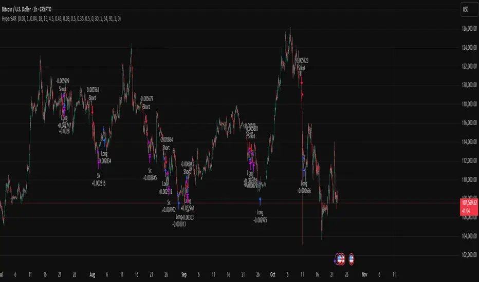 Adaptive Parabolic SAR strategy for liquid stocks, ETFs, futures, and crypto across intraday to daily timeframes. It acts only when an adaptive trail flips and confirmation gates agree. Originality comes from a logistic boost of the SAR acceleration using drift versus ATR, plus ATR hysteresis, inertia on the trail, and a bear-only gate for shorts. Add to a clean chart and run on bar close for conservative alerts.