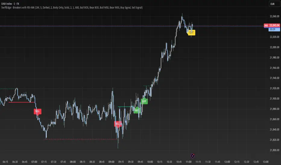 This script is a derivative work based on the original "ICT Breakers" by ICTProTools, used with permission under the Mozilla Public License 2.0. Significant enhancements, including RSI-MA signals, trend filtering, dynamic timeframe adjustments, dual exit strategies, and an AI-style statistics dashboard, were developed by [SwiftEdge]. We express our gratitude to ICTProTools for their foundational work in market structure analysis.