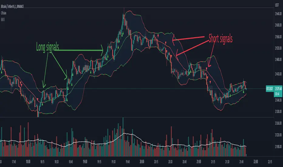 - the appearance of a potential signal for long and short positions when the candle closes behind the upper or lower bands.