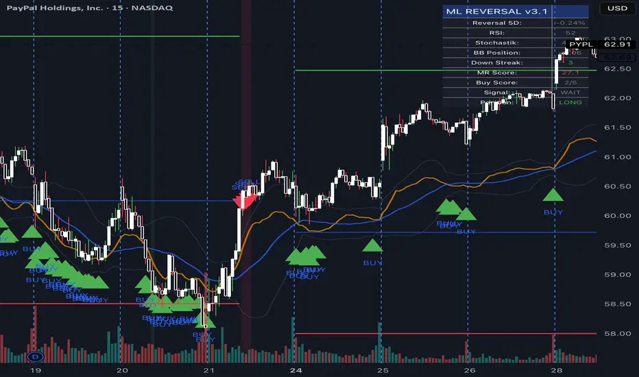 Description: This indicator is designed to identify high-probability market reversals and "dip-buying" opportunities. Instead of relying on a single metric, it uses a confluence scoring system based on 5 technical factors: RSI, Stochastics, Bollinger Bands, Moving Averages, and Price Reversal.