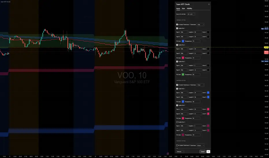- Three MA Pairs Per Timeframe: For each timeframe, configure up to three separate MA clouds (e.g., a 9/12 EMA pair, a 20/50 EMA pair, and a 100/200 SMA pair).