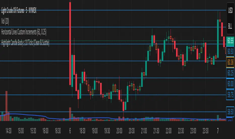 This indicator highlights candlesticks where the body size (difference between open and close) is 10 ticks or less, specifically for instruments like Crude Oil futures (CL) where 1 tick = 0.01.