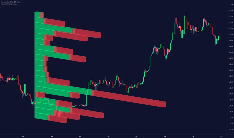 The unique part of this indicator is how the 3D projection is built. Each volume block’s width is scaled to its relative size, then tilted with a slope factor to create a depth effect.Pine Script® maxVol = bins.bu.max() + bins.be.max() width = math.max(1, math.floor(bucketVol / maxVol * ((bar_index - start) * mult))) slope = -(step * dev) / ((bar_index - start) * (mult/2)) factor = math.pow(math.min(1.0, math.abs(slope) / step), .5)