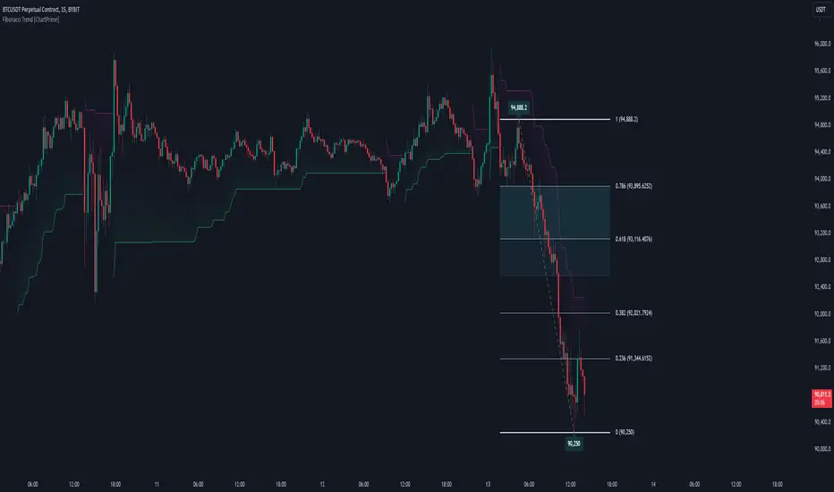 The Fibonacci Trend Indicator [ChartPrime] is a straightforward yet effective tool for identifying trends and key Fibonacci levels. It simplifies analysis by integrating supertrend-based trend identification with Fibonacci retracements, extensions, and optimal entry zones. Whether you're a beginner or experienced trader, this indicator is an essential addition to your toolkit for trend trading, reversal spotting, and risk management.