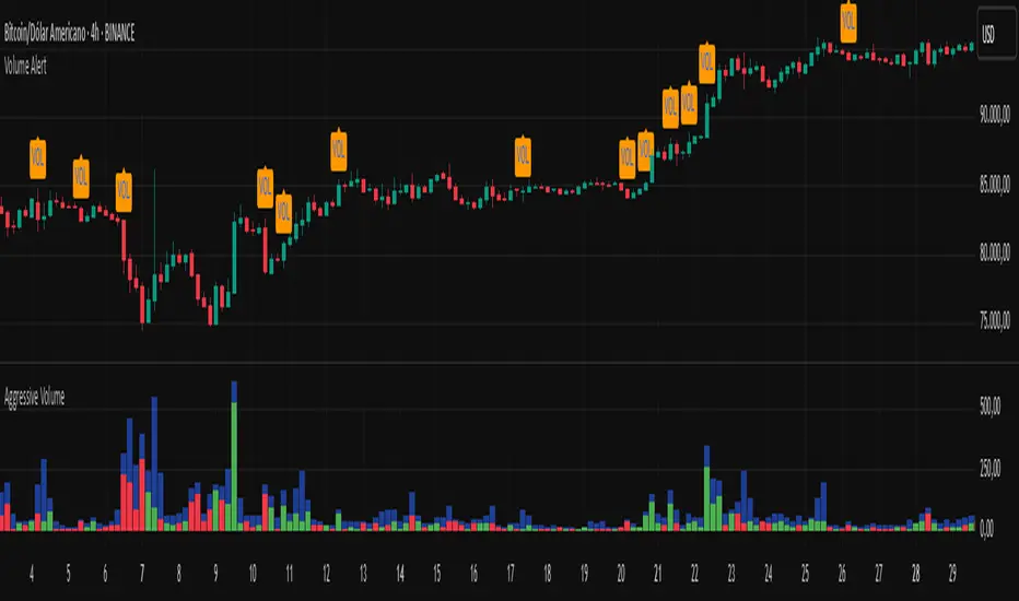 Alerta de aumento de volume: dispara um ícone e alerta quando o volume atual é X vezes maior que o anterior. O valor do multiplicador pode ser ajustado conforme sua necessidade.