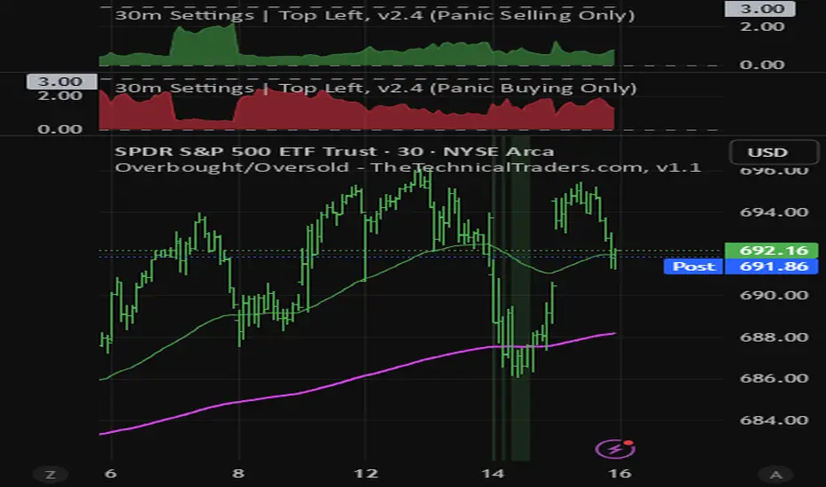 TheTechnicalTraders.com 30-minute overbought and oversold indicator shows where price generally slows and reverses direction. During an uptrend (green bars), focus on oversold levels as support and entry points. During a downtrend (red bars), focus on overbought levels to exit longs, or buy inverse ETFs.