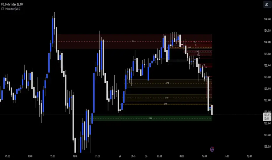 - Added Mid line (C.E.) for FVG Boxes. Toggle on/off enabled. - Added alerts when price mitigates FVG,GAP, VI and Implied FVG Boxes (Works only when the mitigation type is set to engulf).