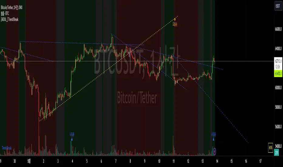 배경은 추세구간을 알려줍니다. 핵심기능은 시그널의 표기입니다.