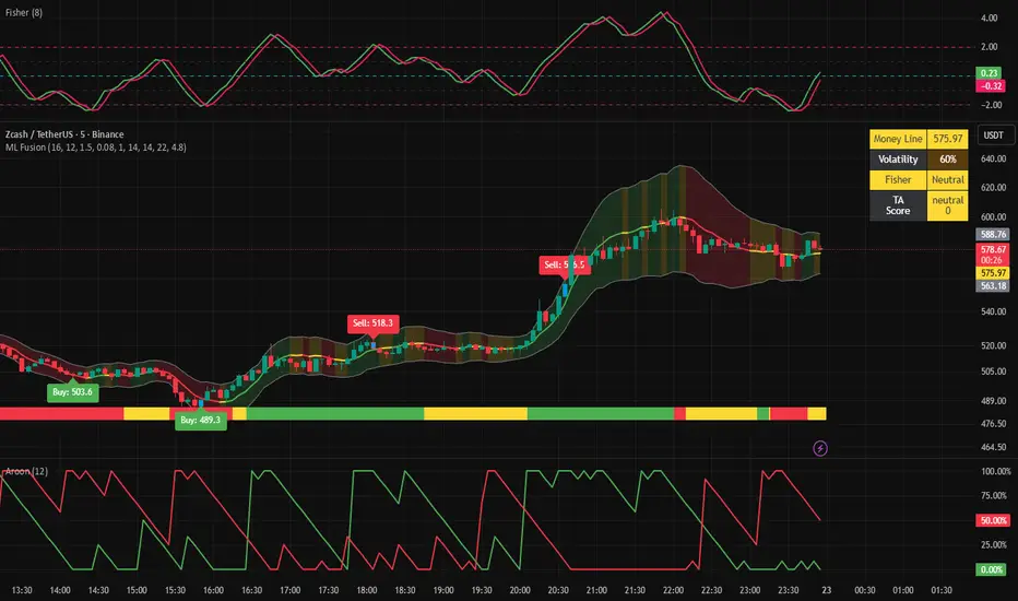 MoneyLine Fusion is a clean, no-nonsense confluence indicator that combines a linear-regression “Money Line” with adaptive ATR bands, Fisher Transform triggers, correct Aroon trend strength, and an instant-read Score (-4 to +4) built from MACD, ADX, MFI and RSI. It only flashes a BUY or SELL label when all the pieces line up — giving you high-probability entries without the noise. The bright lime/red Money Line never blends with candles, the bands stay perfectly anchored no matter how you pan or zoom, and the tiny info panel tells you at a glance exactly how strong the current setup is. In short, it turns five proven tools into one simple, visual decision engine so you spend less time second-guessing and more time catching clean moves.